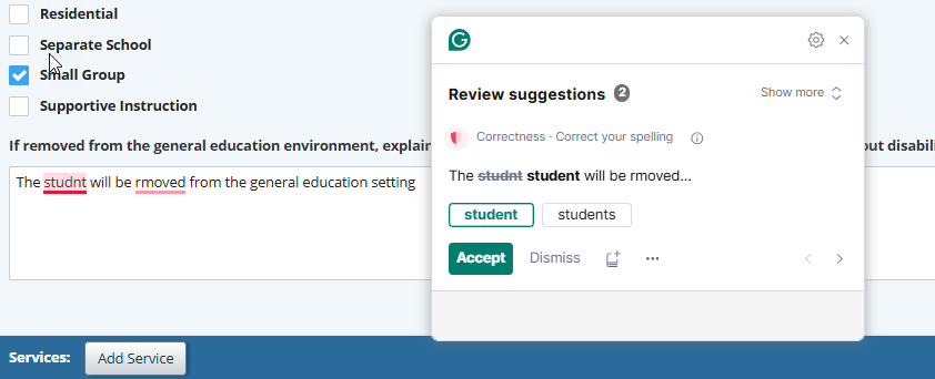 When the right-click function was disabled, districts noted that they were no longer able to use the built-in spellcheck feature. A possible solution to this concern is a free Chrome extension called Grammarly. Once added, the user should hover over the red underlined misspelled word and options will appear for them to select. Grammarly is free for Chrome, Safari and Firefox browsers.