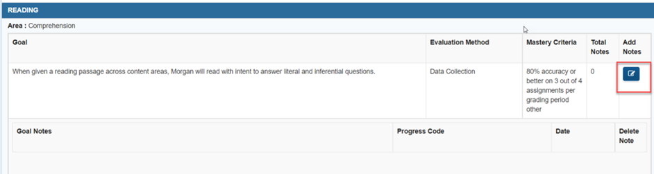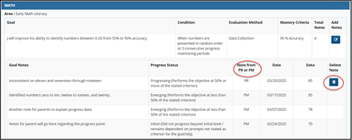 - Goal notes from Progress Monitoring can only be deleted on the Progress Monitoring tab.