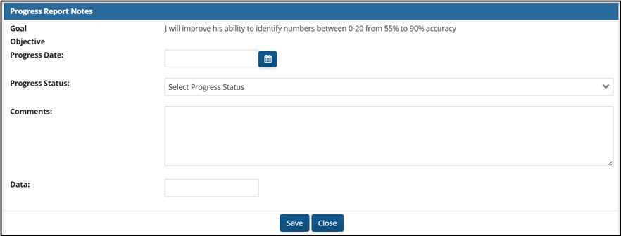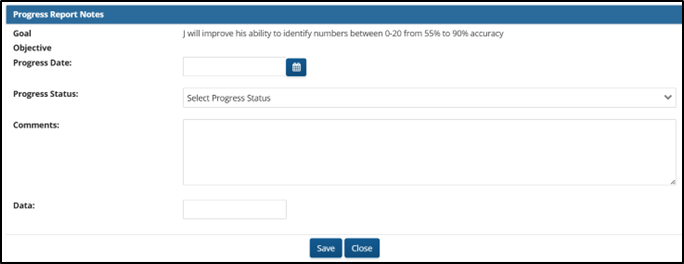 - Add the Progress Date, a Progress Status, Comments, and Data to each goal or objective at least one time per progress period.