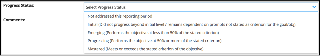 One Progress status code MUST be selected from the drop-down menu to show where the student’s progress is in relation to the goal/objective’s mastery criteria.