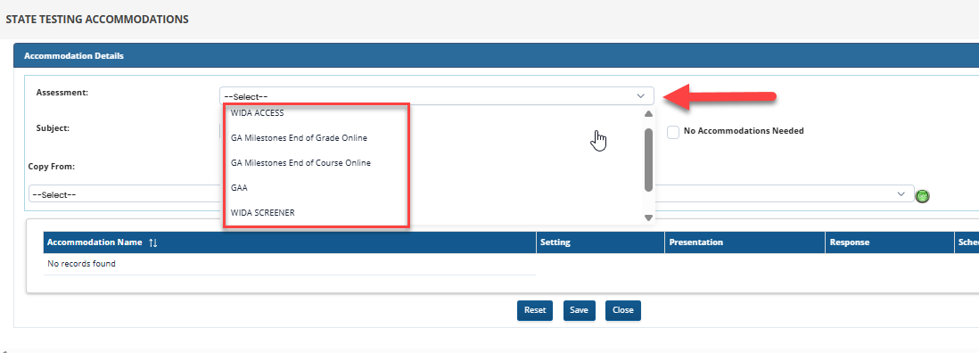 2. Select an assessment from the drop-down list. For each test, you can select the accommodations. Only allowable accommodations identified in the SAH will show for the test that is selected.