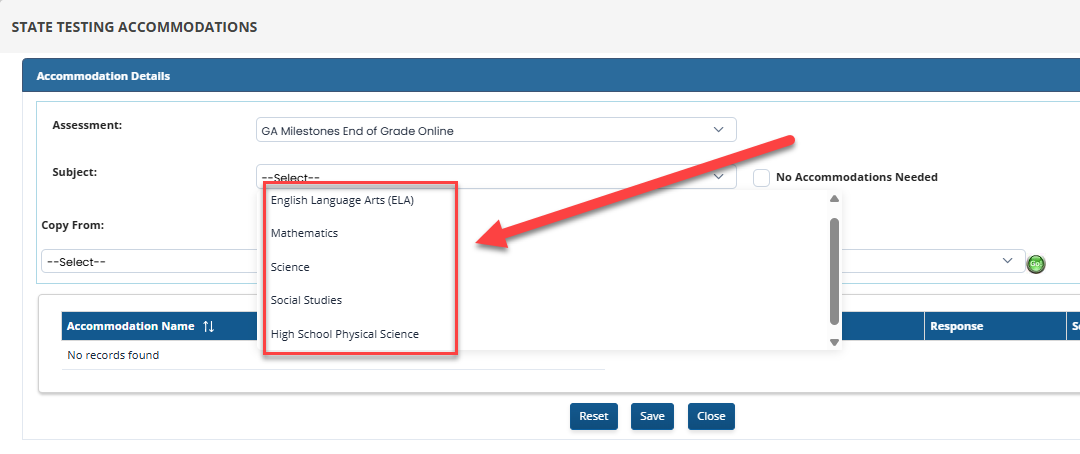 3. Select the subject for the assessment chosen from the drop down box. Accommodation options will display based on the Subject/Domain area selected.