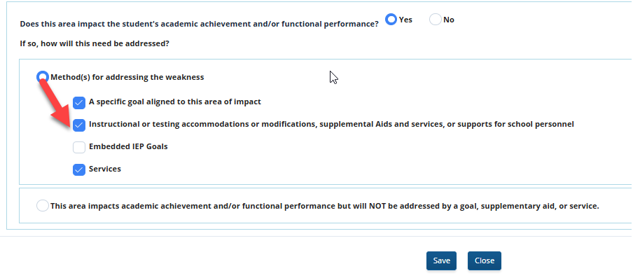 But the need for the accommodation has not been indicated on the Present Levels page. In order to pass audit – the box indicated by the red arrow should be checked.