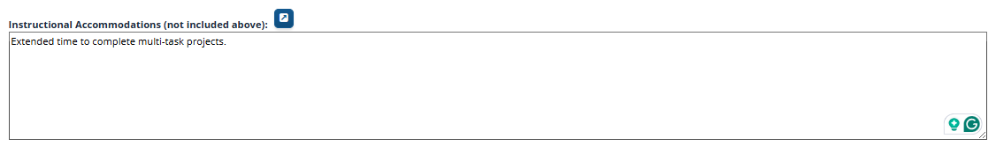 In order to be COMPLIANT, the need for EACH ACCOMMODATION should be justified in the text box for the appropriate area of need, as shown below.