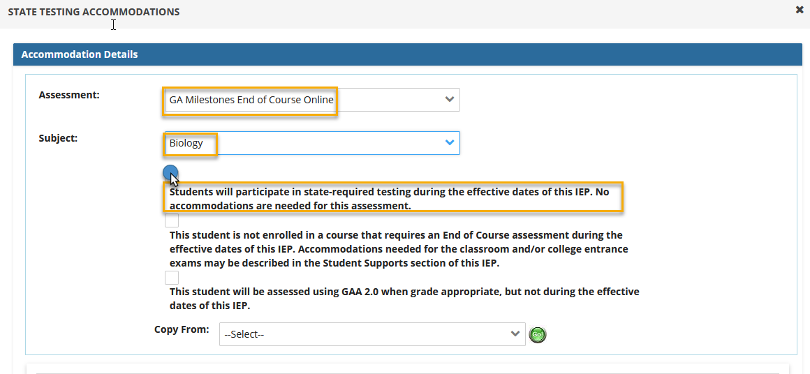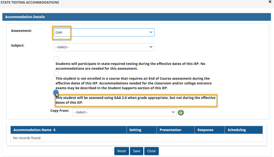 - Select the third radio button if the student will not be assessed on the GAA during the effective dates of the IEP.