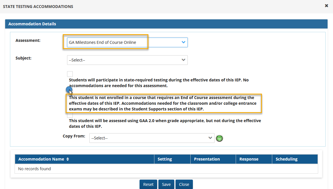On the state testing accommodations page, you can select that the student is not taking any EOC classes or will not test for GAA this year if they do not need any accommodations for those during the effective dates of the IEP. On the state testing accommodation page select add/update accommodation and select the assessment type. The 3 options in the screenshots below will show for students in grades 9-12.
