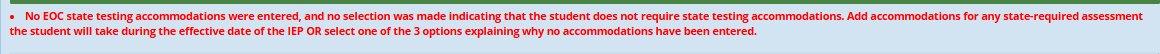 The final audit will require you to select one of these options if no state testing accommodations were added for a student in 9-12 grade.