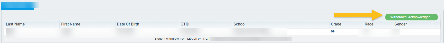 If a student is withdrawn, the status changes and the reason for withdrawal is shown below. Once GaDOE acknowledges the withdrawn student, the status changes to Withdrawal Acknowledged.