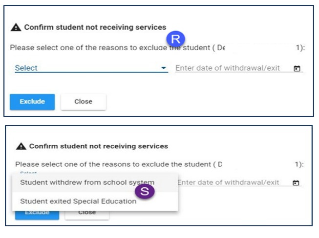 If a student on your list has withdrawn or exited special education, select Student not receiving services (Q) and a pop-up opens (R). Select one of the options available from the drop-down box (S).