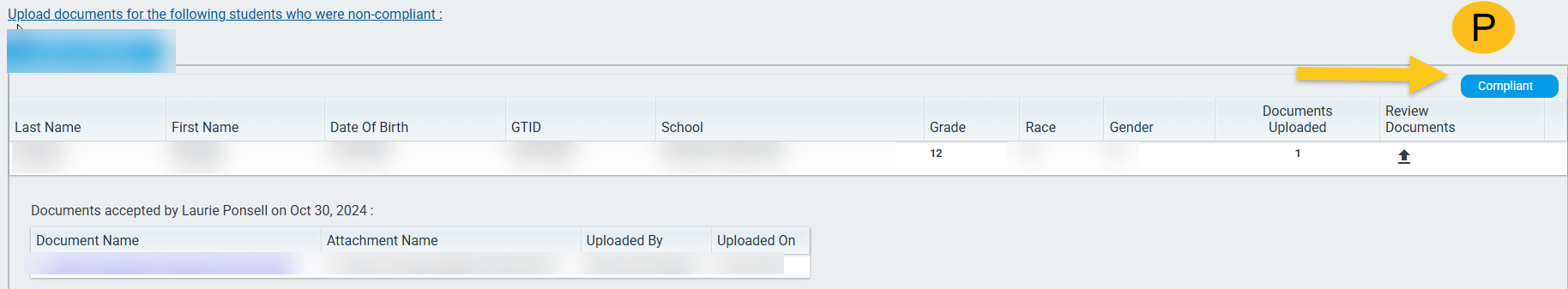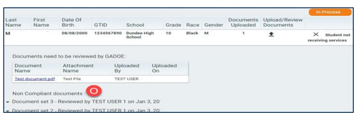 Screenshot of Noncompliant Documents for a Student