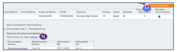If a student’s transition plan is Noncompliant (M), the district will be required to correct the noncompliant transition plan and resubmit it until the plan is 100% compliant. The reason for Noncompliance (N) is available under Noncompliant documents. The rating for that student can be seen by selecting the rating link.