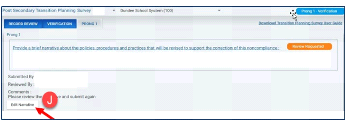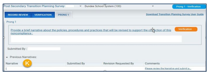 If a revision of the narrative is requested, the LEA must edit and resubmit it. After selecting Edit Narrative (J), a pop-up appears where the user can edit the narrative, save, and submit. Previous narratives are available for viewing (K).