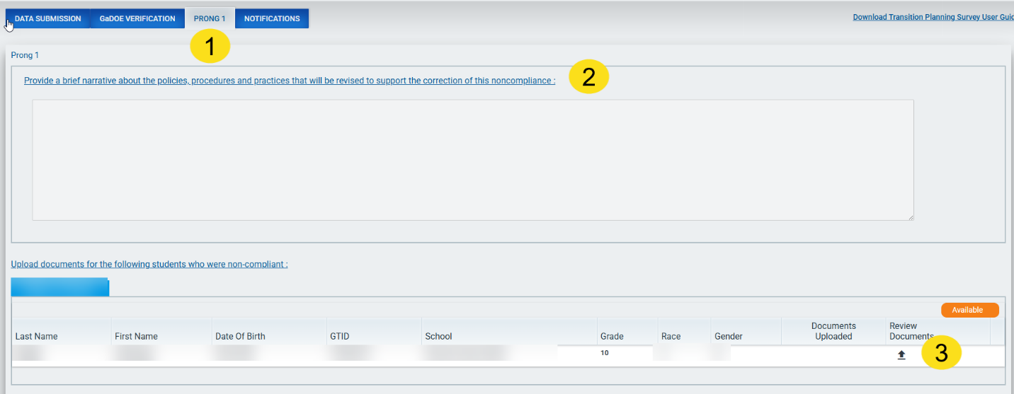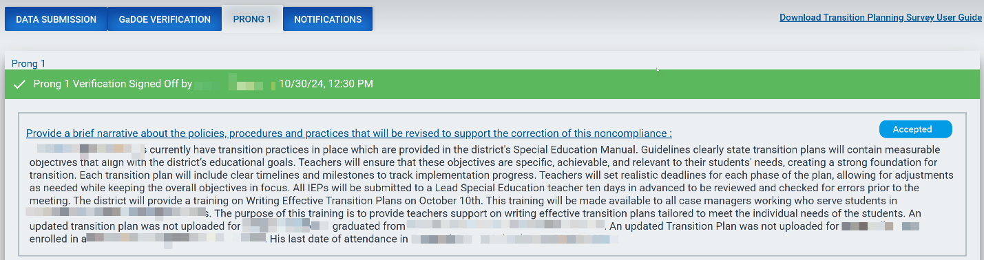 GaDOE reviews the corrected transition plan(s) and updates the status of the plan(s) in the application to Compliant or Noncompliant. When all corrected transition plans meet regulatory requirements, the individual students will be marked as Compliant (P) for the correction of individual noncompliance (Prong 1).
