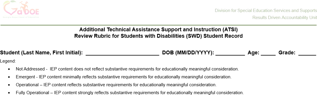 All submitted documents will be reviewed by GaDOE staff using the quality rating review rubric and results will be reported in the ATSI application.
