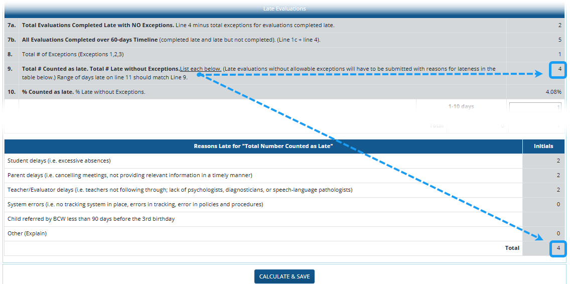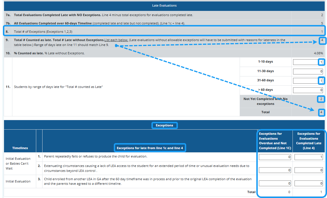 - The total number of evaluations entered for 1-10 days, 11-30 days, 31-60 days, and Over 60 days should match line 7a Total Evaluations Completed Late with NO Exceptions.