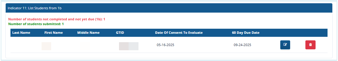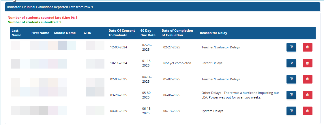 The students will then appear in the section of the landing page titled “Indicator 11:Initial Evaluations Reported Late from row 9”. It will include the date of consent to evaluate, the 60 day due date, and the reason for the delay.