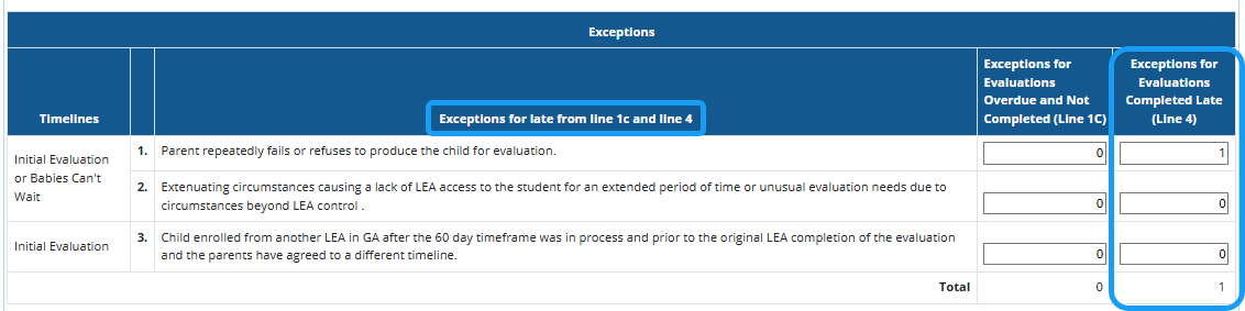 8 Total Number of Exceptions (Exceptions 1, 2, 3): Includes BOTH in process evaluations that are overdue (line 1c) and evaluations completed late (line 4): Auto-calculated total number of evaluations late with allowable exceptions for being late as listed in the Exceptions Section of the Timeline Summary. Exceptions 1, 2, and 3 are applicable to the Initial Eligibility- Child Find Timelines.