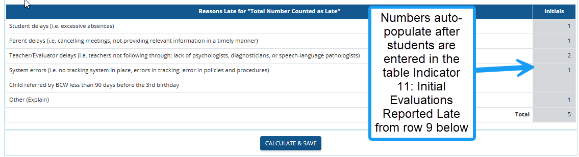 - Each student must also be listed on the table titled ‘List Students from Line 9’. The reasons for Lateness will be entered in the table (along with each student counted as late) titled ‘Indicator 11: Initial Evaluations Reported Late from row 9’ section of the Timelines Summary.