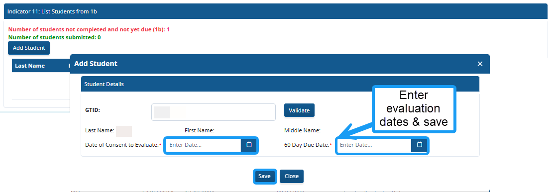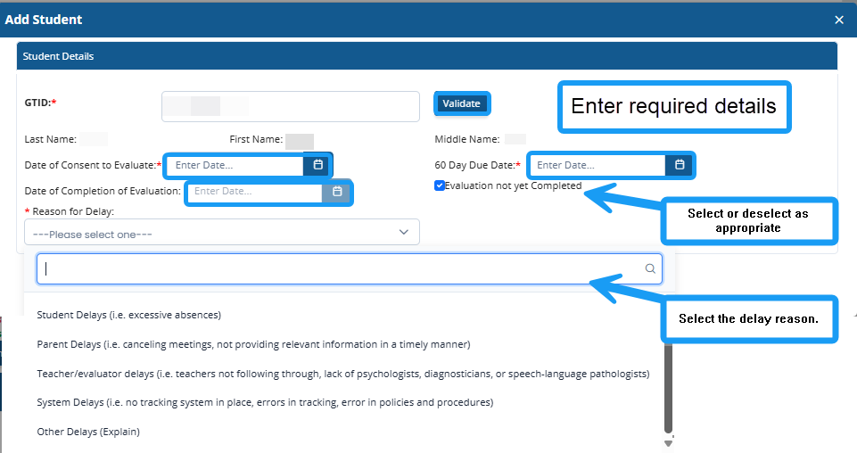 Add each student’s GTID and validate. Then the student’s personal information will appear. Enter the date of consent to evaluate and the 60-day due date. Enter the date of completion of evaluation and select the reason for delay from a drop-down menu.