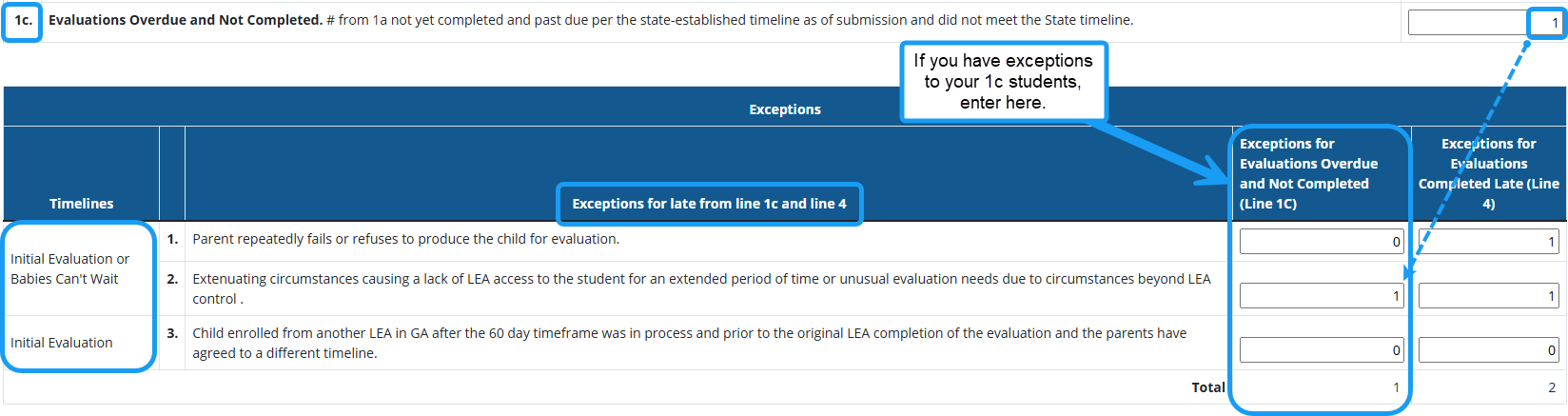1c Evaluations Overdue and Not Completed. # from 1a not yet completed and past due per the state-established timeline as of submission and did not meet the State timeline. Students reported on this line are considered late and will be reported late in this year’s collection.