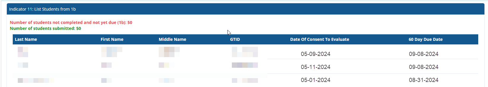 Screenshot of required information in Indicator 11: List Students from 1b