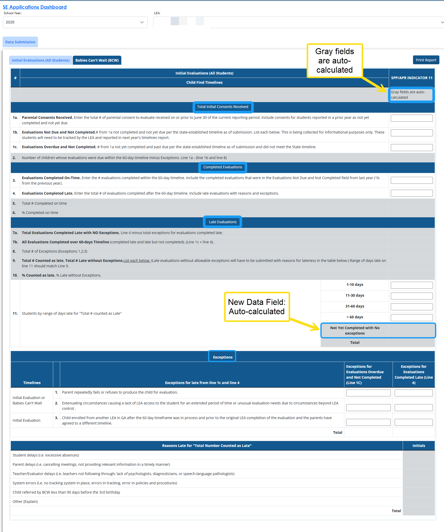 7b All Evaluations not completed in the 60-day Timeline Auto-Calculated total of evaluations that are completed late and late but not completed (Line 1c + line 4). This includes those late with exceptions.