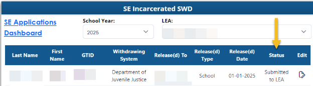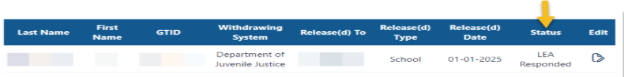 Enter the Incarcerated Students application and select edit feature at the end of the row. The LEA will select the response that best fits the student’s return.