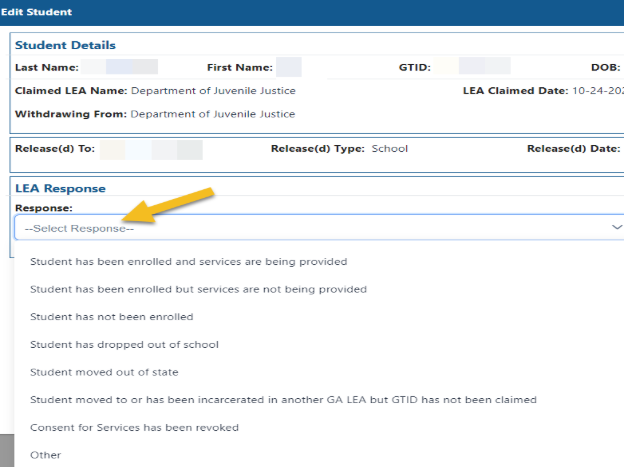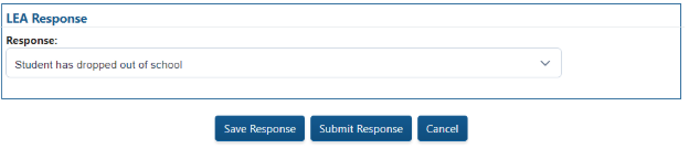 The LEAs will not be able to select a response for a student until the LEA has claimed the GTID. The Response options include: