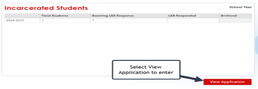 The tile will show the total count of students for the LEA, the count of students requiring an LEA response, the count of students for whom the LEA has already responded, and the count of students archived by GaDOE. the released student in Incarcerated Students application showing in the column, “Awaiting LEA Response.”