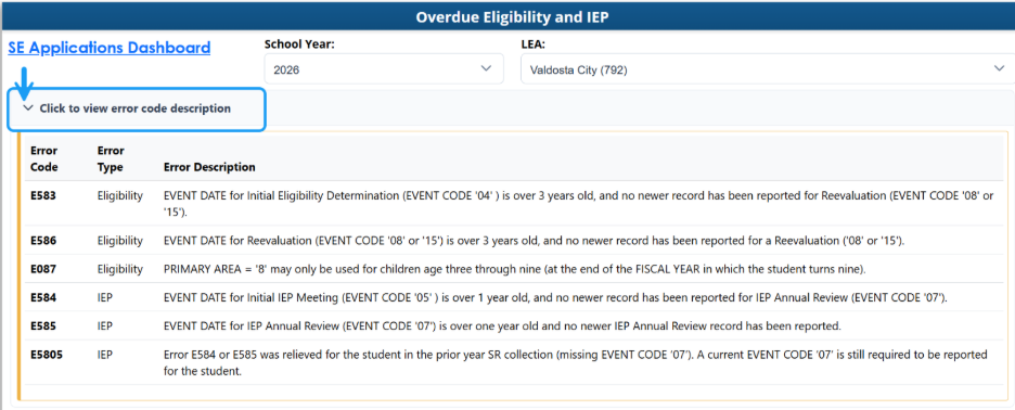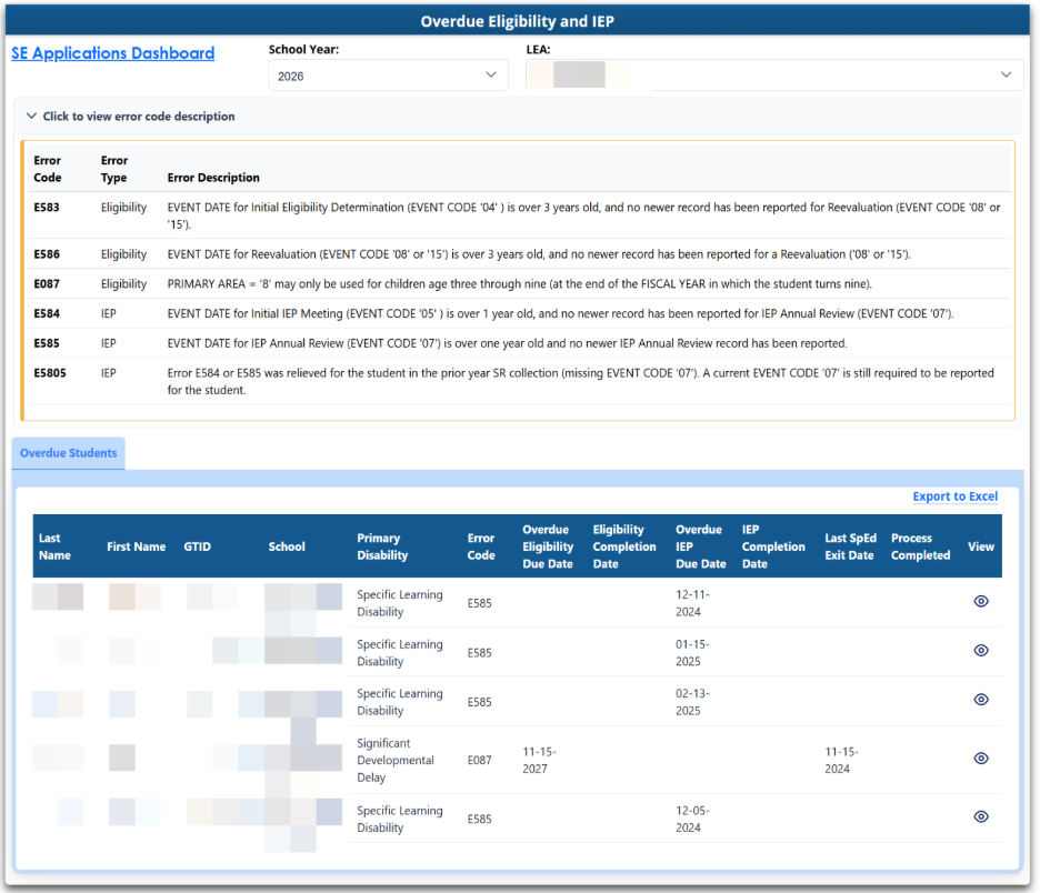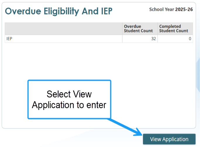 Screenshot of the landing page for the Overdue Eligibility and IEP