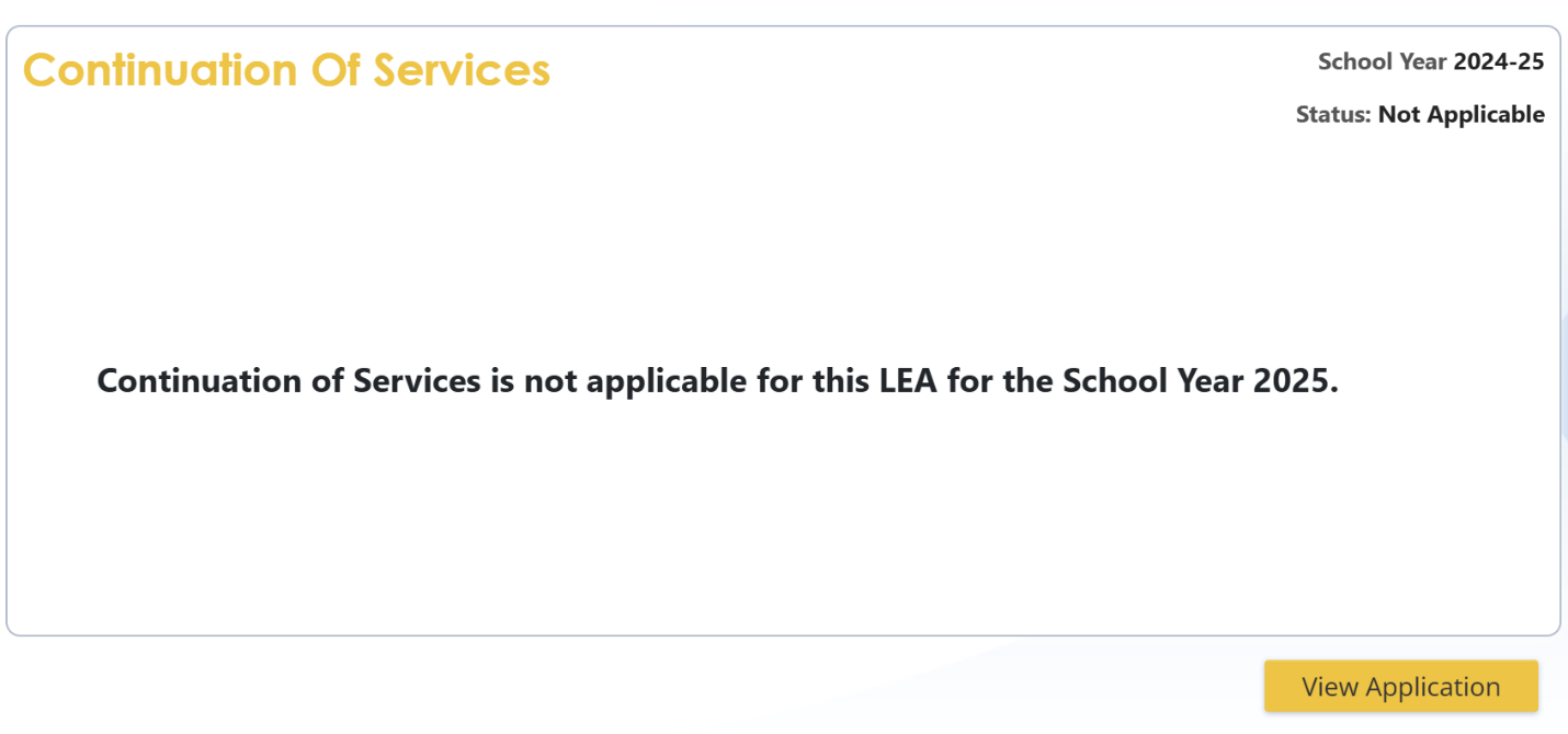 If your LEA reported no incidents of failure to provide FAPE for cumulative disciplinary exclusions of greater than ten school days in the Student Record Student Safety Reports, the Continuation of Services verification report will state “Continuation of Services is not applicable for this LEA for the School year 20XX.” No additional response is required.