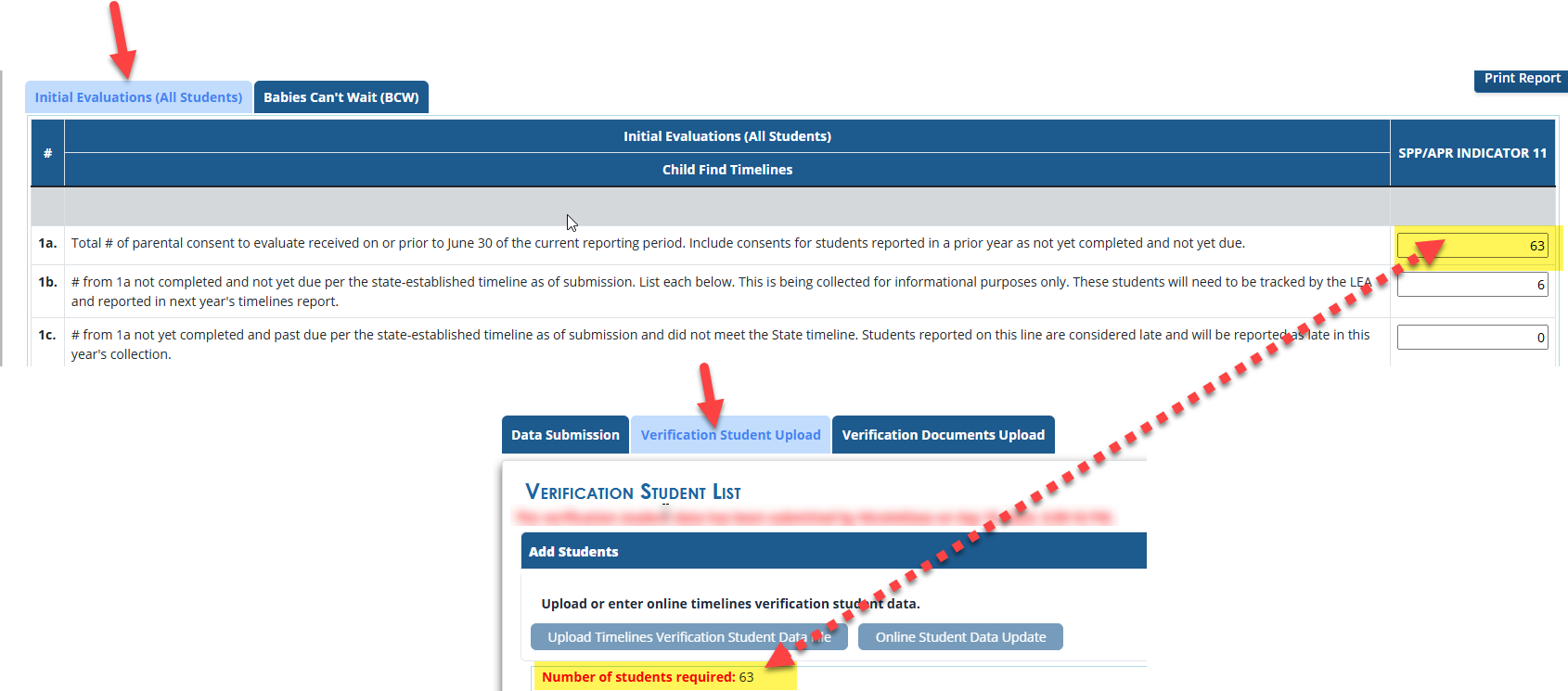 LEAs selected must upload information on all students reported in the previous Indicator 11 timeline submission. If the LEA reported receiving sixty-three (63) consents to evaluate (of line 1a of Indicator 11 submission) for the prior school year, then the LEA must submit sixty-three (63) names and GTIDs.