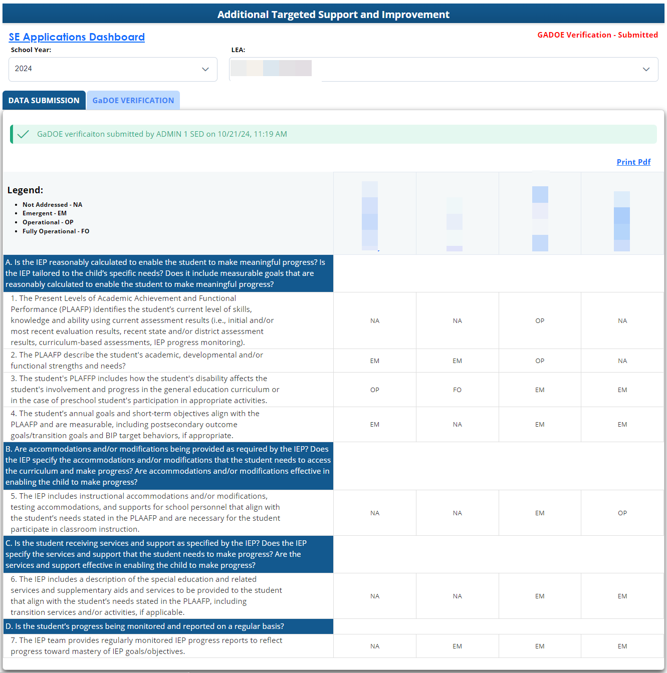 LEAs may print PDFs of the review by selecting “Print PDF” from the GaDOE verification tab.
