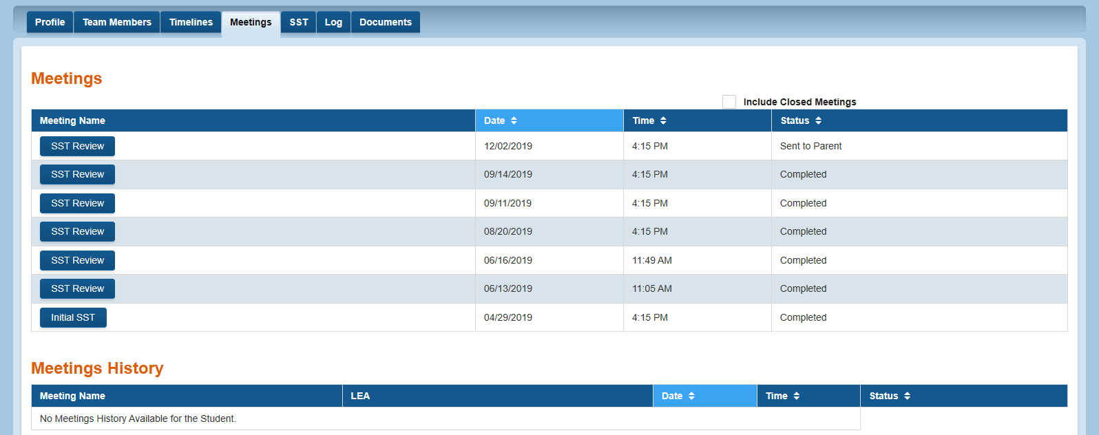 Meetings are initiated from the Time Lines page. This page becomes active when a user clicks on the the Start Initial SST link on the Timelines page.